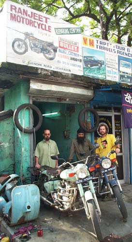 What Thar Be: A popular retirement spot for Indian army officers, the city is well-to-do and filled with old guns, motorcycles, and lots of other antiques. "True Values" Internet shop on Rajpur Road, run by Sanjeev Dhingra, is a nice place for emailing, vehicle rentals, and general info on the area. Ranjeet's Motorcycle Repair shop on Gandhi Road is a friendly and interesting bike shop. Ranjeet, one-time employee of Inder Motors in Delhi where we purchased our Enfields, showed us many old bikes and passed the time with free samosas and Cokes.